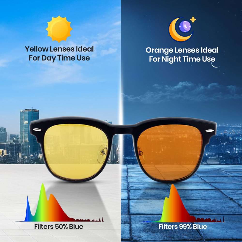 Geel wordt vaak gebruikt voor nachtblindheid, auto rijden in het donker of zoals ze het in het Engels meestal verwoorden 'nightdriving' omdat er een significante filtering plaatsvindt maar er nog genoeg licht binnen komt om veilig te kunnen rijden. Wij adviseren dan ook niet te rijden in het donker met orane of rode glazen.